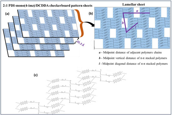 Schematic illustration of (a) self-assembled 2:1 PDI-mono(4-imz)/PDCDDA into “chessboard” pattern sheets after UV exposure (“UV” = 254 nm exposure for 10 min at room temperature, and “Heat” = 150 °C for 1 h.). (b) Single lamellar sheet, and (c) head-with-head and head-with-tail configurations of the polymer.