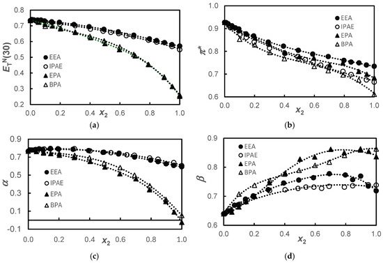 Regarding the , Figure 2b, the marked negative π* difference between alcohol and water attenuates as the amine is added, becoming practically null from x2 ≈ 0.6 for the EEA, IPAE, and EPA systems and from x2 ≈ 0.1 for the BPA system. However, a minimum is observed in the case of secondary amines for x2 ≈ 0.03. In the BPA system, the values are slightly positive, although they are within mutual uncertainty.