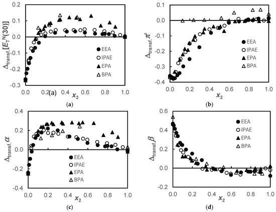 The pairing of the behavior observed in Figure 1a for the secondary amines EEA and IPAE and the primary amines EPA and BPA is also verified in the transfer function, , depicted in Figure 2a. This transfer function presents negative values up to x2 ≈ 0.2, becoming positive from this molar fraction onward, but more positive ones in primary amines. Since is a mixed parameter, simultaneously measuring dipolarity/polarizability, π*, and acidity, α, these parameters will be analyzed below. In Figure 2c, the same pairing described for the function is observed for α, showing that this last function predominantly reflects the acidity of the solvent.