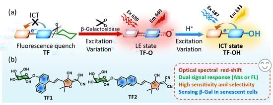 (a) β-Gal-responded fluorescent probes provide ratiometric optical signal by excited-state altering from ICT to LE states. (b) Structures of TCF-based fluorescent probes (TF1 and TF2).