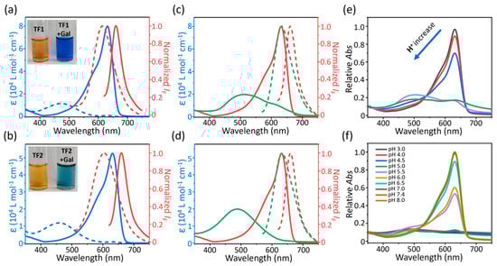 With two probes in hand, we initially investigated the photophysical variations of TF1 and TF2 for the response of β-Gal. A yellow solution of TF1 or TF2 displayed wide absorption band at 475 m (ε = 1.14 × 104 L mol−1 cm−1) and 460 nm (ε = 1.19 × 104 L mol−1 cm−1) and feeble fluorescence at 613 nm and 604 nm in PBS buffer (pH 7.4, 1 mM) mixed with 10% DMSO, respectively. Surprisingly, the sample color of TF1 was distinctly changed to blue upon addition of β-Gal (4 U mL−1). The residue of TF1 exhibited a red-shifted absorption at 632 nm (ε = 8.01 × 104 L mol−1 cm−1) and fluorescence at 661 nm (ΦF = 1.25%). The residue of TF2 was monitored to discern any similar variations of the optical property, i.e., that the wavelength of absorption and fluorescence maxima were located at 631 nm (ε = 5.2 × 104 L mol−1 cm−1) and 659 nm (ΦF = 1.03%), respectively (Figure 1a,b, Table S1). In comparison to the large stokes-shifts (ca. 140 nm) of TFs (TF1 and TF2), the residues possess shrunken stokes-shifts of less than 30 nm (Table S1). It is well known that ICT-based fluorescent probes generally exhibit fluorescence enhancement and slight absorption variation with large stokes-shifts, rather than drastic red-shifts and increased absorption with small stokes-shifts [34,35,36].