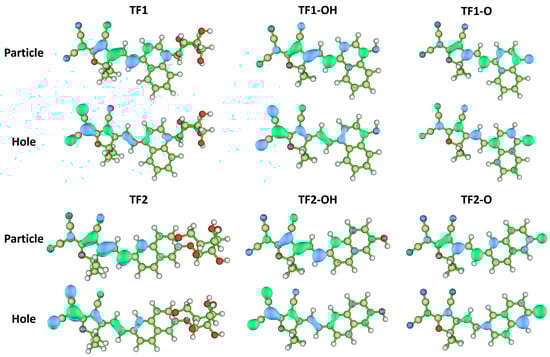 Calculated natural transition orbitals (NTOs) of TF1, TF2, TF1-OH, TF2-OH, TF1-O and TF2-O using density functional theory at the PBE1PBE/6-31G* level of theory in the gas phase.