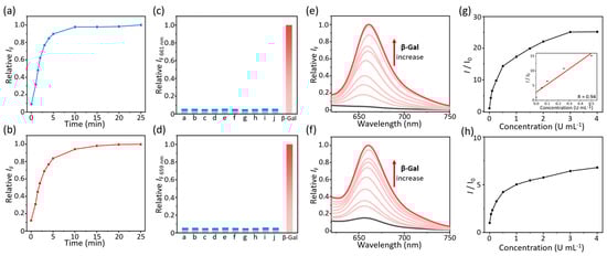 By utilizing ratiometric absorption and activatable fluorescence at ca. 660 nm, we evaluated the detection capability of TF1 and TF2 targeting at β-Gal. The absorption and fluorescence changes of TFs were recorded in the presence of β-Gal (4 U mL−1) incubated for different lengths of time. When the time was increased, a ratiometic absorption variation was observed from 475 nm to 632 nm, followed by a time-dependent fluorescence enhancement at 661 nm (λex = 570 nm, Figure S5). Similar optical spectrum changes in TF2 were measured while incubated β-Gal within 25 min (Figure S6). For both TF1 and TF2, the fluorescence was dramatically enhanced until a plateau was reached after the enzyme had been incubated for over 10 min, indicating that the two probes could rapidly detect the β-Gal as well as generate the color or fluorescence difference in the solution (Figure 4a,b and Figure S7). Then, the absorption and fluorescence spectra of probes were measured in the presence of different analytes, including H2O2, NaClO, homocysteine (Hcy), cysteine (Cys), glutathione (GSH), deoxyribonucleic acid (DNA), Bull Serum Albumin (BSA), cellose, β-glucosidase, and β-Gal. Besides the glaring emission of β-Gal, other analytes cannot “turn-on” the fluorescence of TF1 or TF2 at ca. 660 nm. The glycosidic bonds could only be hydrolyzed by β-Gal, indicating that the probes have satisfied selectivity for the enzyme (Figure 4c,d, Figures S8a and S9a). The absorption spectra further demonstrated the single-response ability targeting β-Gal in solution (Figures S8b,c and S9b,c).