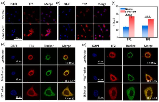 Fluorescence imaging of normal and senescent A549 cells incubated with (a) TF1 and (b) TF2 (10 μM) for 4 h. (c) Fluorescence quantification of normal (blue) and senescent (red) A549 cells incubated with TF1 and TF2 (10 μM) for 4 h. Fluorescence co-localization of (d) TF1 and (e) TF2 (10 μM) with LysoTracker (a lysosome tracker, 75 nM), MitoTracker (a mitochondria tracker, 75 nM)), and ERTracker (an endoplasmic reticulum tracker, 75 nM). Excitation and emission wavelength of TFs were 640 nm and 650–700 nm, respectively. Error bars represent the S.D. *** p < 0.001; n = 3.