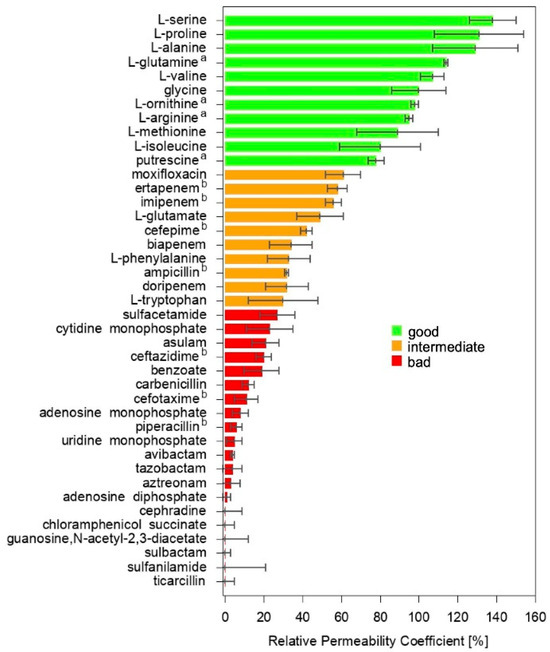 The relative permeability of OmpF from E. coli to a set of 30 substrates was estimated with the liposome swelling assay (LSA), and an additional 11 data points were taken from the literature (same method) [23,26]. The data set, 41 substrates in total, comprised both antibiotics and non-antibiotic substances (Figure S1). They were selected to sample different chemical classes, namely, amphenicols, amino acids, b-lactamase inhibitors (including b-lactams and diazabicyclo compounds), carbapenems, carbohydrates, cephalosporins, fluoroquinolones, monobactams, nucleosides, nucleotides, penicillins, and sulfonamides. Besides having a sufficient water solubility to be investigated with LSA (logP at pH 7.4 was in the range between −0.1 and −14.9), these molecules were selected to sample a wide range of values for different chemico-physical descriptors considered to have significant impact on translocation through general porins [6,7,9,13,14,16,20,22,24,27]; namely, the molecular weight (75–546 g/mol) and Van der Waals volume (68–435 Å3), rotatable bonds (1–11) and ring counts (0–5), Van der Waals area (120–691 Å2), polar surface area (40–258 Å2), minimal (19–80 Å2) and maximal (25–120 Å2) projection area, and the electric net charge (−2.5–+2.0/e) and dipole moment (0.0–66.2 D). The values obtained for the minimum energy conformer of the main protonation state at pH 7.4, as evaluated through MarvinSketch, are listed in Table S1. Figure 3 shows the relative permeability coefficient (RPC, relative to glycine) obtained for all the substrates in the data set.