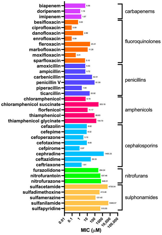 The obtained values were in general agreement with those reported for E. coli as per EUCAST [Testing TECoAS], although with some grade of variability as the latter are based on different E. coli strains as well as on clinical isolates. As expected, the most dated antibiotics, such as sulfonamides and nitrofurans, showed the highest average MICs. In particular, sulfacetamide and sulfanilamide showed the highest MICs (4735 and 5947 µM, respectively) among all the antibiotics tested (Figure 4). In addition, the difference between the first- and fourth-generation cephalosporins was remarkable, such as in the case of cefradine vs. cefpirome, with MICs of 1465 and 0.97 µM, respectively. This observation is primarily justified by the narrow-spectrum activity against Gram-positives of the former, compared to the broader-spectrum of the latter, which is highly effective also against Gram-negatives and which is endowed with increased resistance to beta-lactamase enzymes [31]. Penicillins show a similar trend when the aminopenicillins (i.e., amoxicillin and ampicillin), designed to affect Gram-negatives, are compared to the natural penicillins, such as penicillin V (also known as phenoxymethylpenicillin), which, together with penicillin G (benzylpenicillin), exerts a potent effect mainly against Gram-positive bacteria, those belonging to the Staphylococcus genus in particular [32]. Amphenicols, fluoroquinolones, and carbapenems differ from this pattern, showing lower and more consistent MIC values within their respective classes. This is likely due to their broader spectrum of action and relatively more recent discovery compared to “first-generation” antibiotics, such as sulfonamides, penicillins, and cephalosporins.