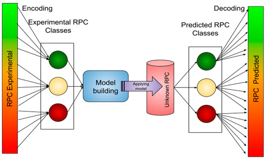 The availability of relatively few RPC data largely limits the estimation of MIC dependence on permeability. Here, we present an approach to first encode our RPC data into three classes and then create a classification model that is applied to molecules with a known MIC but unknown RPC. Once the prediction is made, the predicted classes are decoded into continuous RPC values by implementing the weighted probability function described in the SI. The procedure is depicted in Figure 6.