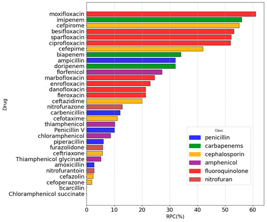 We applied the selected model, LR-III, to the antibiotics with known MIC values but devoid of experimental RPC, again performing the classification and then decoding to continuous RPC values. As a result, we have assigned RPC values either experimentally or computationally to all the antibiotics with known MIC values (Figure S2). Figure 7 shows the results, where we have illustrated the RPC distribution over the antibiotics and corresponding classes.