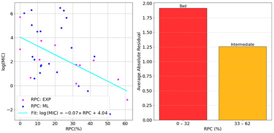 Correlation analysis of the MIC vs. RPC data points through the Logistic Regression model with ElasticNet regularization (left) and the residual analysis (right).