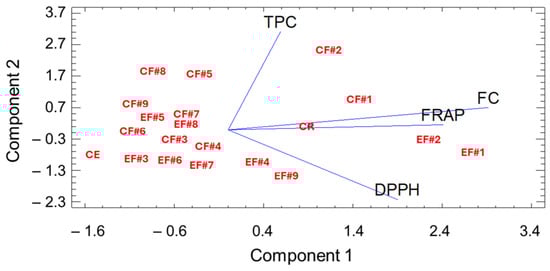 In order to enhance the study of the antioxidant activity of the analyzed samples, a principal component analysis (PCA) was performed. It was shown that the total phenolic content of the formulations is also intimately related to the antioxidant activity of the analyzed samples (Figure 1). PCA explained 63.09% of the total variation of the data, and it was performed considering the total phenolic content of raw and extruded chickpea-rice-based flours and its in vitro antioxidant activity evaluated by Folin–Ciocalteau, DPPH, and FRAP assays. Component 1 (characterized by antioxidant activity) showed 34.35% of the total variation of the data. On the other hand, component 2 (characterized by total phenolic content) explained 28.74% of the total variation of the data. These findings align with previous research indicating that extrusion may either enhance or degrade antioxidant activity depending on the extent of thermal processing, potential polymerization of phenolic compounds, and the release of bound phenolics [44]. Although some phenolic compounds are susceptible to heat degradation, extrusion can also enhance antioxidant potential by breaking down cell walls and increasing the bioavailability of phenolics, as observed in studies on extruded legumes [41]. The balance between these opposing effects is highly matrix-dependent, emphasizing the need for an optimized processing approach that maximizes the retention of bioactive compounds.