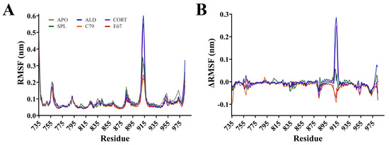 Root mean square fluctuation (RMSF) calculations measure the flexibility of residues within the protein backbone. RMSF analysis showed that fluctuations mainly occurred in loops located between helices of the MR (Figure 3). The largest fluctuation occurred at residues 910 to 915 in the loop connecting helices 9 and 10, with an RMSF of up to 0.60 nm for ALD and CORT. The ΔRMSF was calculated, where RMSF values of the APO system were subtracted from ligand-bound MR and shown in Figure 3B. The ΔRMSF for residues 910 to 915 is shown in Figure S2A, indicating that for this region of the protein, the endogenous ALD and CORT-bound MR have a larger difference in RMSF compared to the other systems. An ΔRMSF of 0.29 and 0.24 nm at residue 913 was observed for ALD and CORT, respectively. For these residues, SPL had a similar RMSF to APO, while C79 and E67 had a modest suppression in ΔRMSF of −0.09 nm and −0.07 nm at residue 913, respectively. This suggests a potential difference in the dynamic behaviour of the MR in response to antagonists versus receptor activation. This region of the receptor is distant from the ligand binding pocket of MR, consistent with the binding of antagonists to MR influencing movement in regions of the protein beyond the immediate binding site [4].
