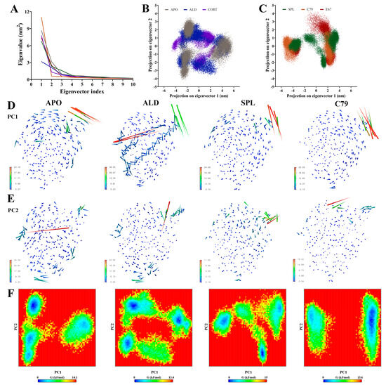 Principal components analysis (PCA) was employed to filter large-scale concerted motions from the MD simulation trajectories to study the main motions of the protein complex that occur in response to ligand binding. Analysis of the eigenvalues demonstrated that the first two principal components (PCs) captured the majority of protein motion in the combined trajectories for all systems (Figure 4A). Two-dimensional projection of the first two PCs showed that while all plots occupy a similar subspace, APO, ALD, and CORT (Figure 4B) had a larger spread in values compared to SPL, C79, and E67 (Figure 4C). Particularly for ALD and CORT, the 2D projection indicated more overlap between replicate simulations. This suggests that the binding of ligands can induce different structural rearrangements within the MR LBD.