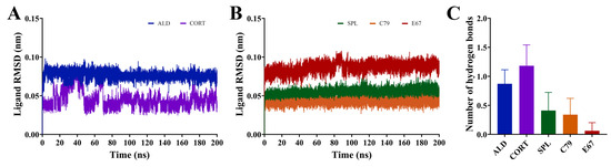 The docked structures of ALD, CORT, SPL, C79, and E67 served as starting structures for analysis with MD simulations. The chemical structures of these compounds are shown in Figure 1B.