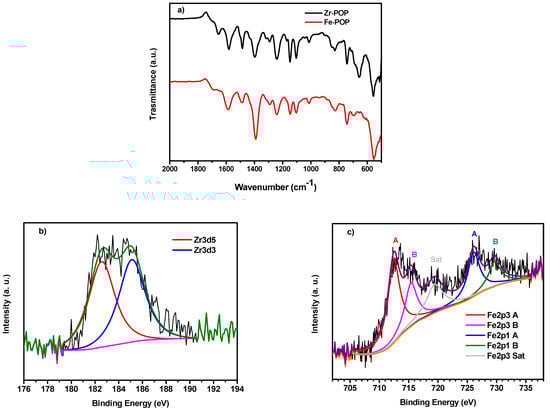 (a) FTIR spectra of Zr-POP (black) and Fe-POP (red). XPS spectra of (b) Zr-POP-QA and (c) Fe-POP-QA.