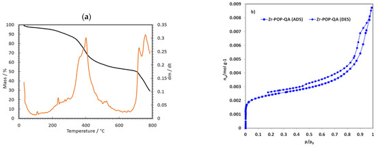 The surface area of Zr-POP-QA was evaluated by N2 sorption measurements at 77 K. The adsorption isotherm shown in Figure 3b is of type 4 [52]. The calculated BET surface area, in the domain p/p° = 0.05–0.15, is quite high: 192.5 m2/g. In the high-pressure region above p/p° = 0.8, mesopores are filled, resulting in a hysteresis loop. The average pore diameter, calculated using the BJH method, is 6.3 nm.