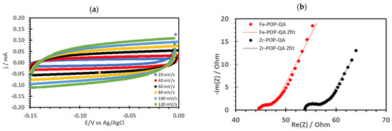 (a) Cyclovoltammograms of Fe-POP-QA at various scan rates and (b) impedance spectra of POP-QA electrodes in 0.1 M KOH. Dots: experiment, dashed lines: Zfit plot.