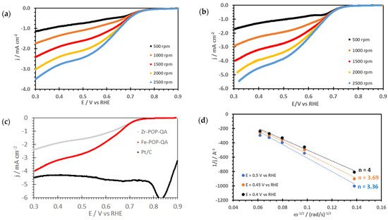 Koutecky–Levich plots (Figure 5d) show that a large amount of 4-electron reduction is observed; the number of exchanged electrons attains n = 4 at E = 0.4 V vs. RHE for Fe-POP-QA, whereas n = 3.12 for Zr-POP-QA. The higher electrocatalytic activity of the Fe-containing electrode was expected given the relatively easy valence change in Fe ions, compared to Zr ions. However, even the Zr-POP-QA shows a significant electrocatalytic performance, which can be attributed to the high ECSA with catalytically active centres and ionic groups in nanometric proximity.