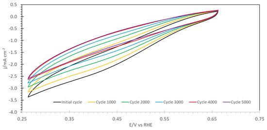 Accelerated degradation tests for Zr-POP-QA: cyclovoltammetric curves for the ORR in oxygen-saturated 0.1 M KOH solution at 1500 rpm RDE speed as function of the cycle number.
