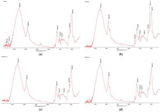 To analyze the composition changes in triticale flours, FT-IR with a Nicolet iS-20 spectrophotometer (Thermo Scientific, Karlsruhe, Dieselstraβe, Germany) in attenuated total reflectance (ATR) mode was used. For that purpose, a resolution of 4 cm−1 was applied in the wave number range from 4000 to 650 cm−1. For FT-IR spectra analysis, a sample of 2 g of triticale flour was pressed and the pellet obtained was placed on the ATR crystal.