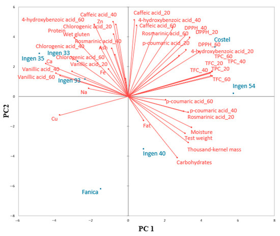 A PCA graph of the triticale flours related to their physicochemical characteristics is shown in Figure 2. The two axes, PC1 and PC2, represent 27.46% and 34.02% of the total variance. All the wheat grain species are closely associated with the PCA graph. Along the PCC axes, Costel and Ingen 54 are mostly related to TPC, TFC, and DPPH assay values. Ingen 40 is more related to carbohydrate content, fat value, and physical characteristics thousand-kernel mass and test weight. The triticale varieties Ingen 33, Ingen 35, and Ingen 93 are closely related to protein, gluten content, ash, vanillic acid, chlorogenic acid, and mineral elements Na, Ca, Fe, and Zn.