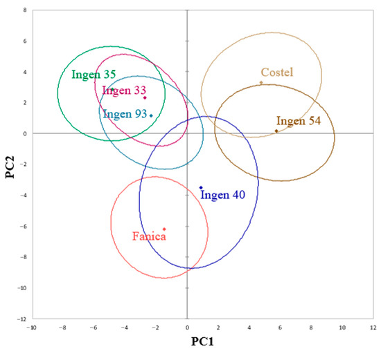 A PCA plot for triticale varieties positioned by function of their physicochemical characteristics data is shown in Figure 3. The total variance in the PC axes was 61.47%, of which PC1 accounts for 34.02% and PC2 for 27.46%. As can be seen, Costel and Ingen 54 are closely related to each other, being placed on the left top side of the graph, whereas Ingen 35, Ingen 33, and Ingen 93 are placed on the right top side. Along the PC1 axis, Fanica and Ingen 40 are the mostly related to each other, whereas both PC axes clearly distinguish Fanica by Costel and Ingen 54 varieties.