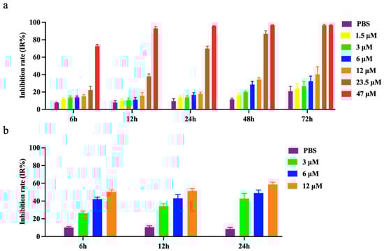 Inhibition rate of prNK-lysin on AML-12 hepatocytes and Hepa1-6 cells. (a) AML-12 hepatocytes were treated with the indicated concentration of prNK-lysin for 6 h, 12 h, 24 h, 48 h, and 72 h, (b) Hepa1-6 cells were treated with the indicated concentration of prNK-lysin for 6 h, 12 h, and 24 h.