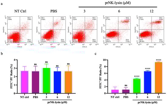 An Annexin V and PI double staining assay was used to analyze the effect of the treatment with prNK-lysin for 24 h. (a) Flow cytometry plots, (b) the bar statistics of the FITC+/PI− cells rate, (c) the bar statistics of the FITC+/PI+ cells rate. The ns means not statistically significant, and **** indicates p < 0.0001.
