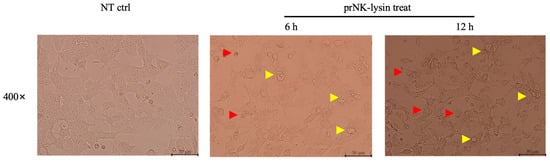The morphological changes in the Hepa1-6 cells treated with 12 μM of prNK-lysin for 6 h and 12 h were observed by Inverted Microscope (Scale bar = 10 μm. Yellow arrow →: membrane surface blebs, Red arrow →: cellular swelling).