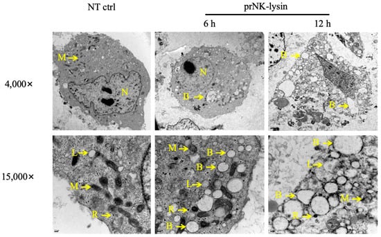 The morphological changes in the Hepa1-6 cells treated with 12 μM of prNK-lysin for 6 h and 12 h were observed by Transmission Electron Microscope (Scale bar = 1 μm and 0.2 μm. N: Nuclear, M: Mitochondria, R: Ribosome, L: Lysosome, B: Blebbing).