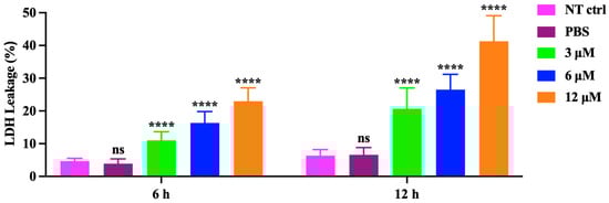 Lactate dehydrogenase (LDH) release in Hepa1-6 cells treated with different concentrations of prNK-lysin for 6 h and 12 h. The ns means not statistically significant, and **** indicates p < 0.0001.