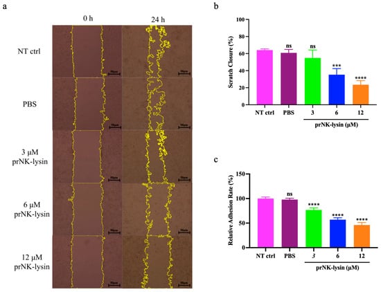 The scratch healing and adhesion of the Hepa1-6 cells treated with different concentrations of prNK-lysin for 24 h was observed and analyzed. (a) Images of scratch healing of the Hepa1-6 cells (scale = 50 μm), (b) the bar statistics of scratch healing of the Hepa1-6 cells, (c) the bar statistics of adhesion of the Hepa1-6 cells. The ns means not statistically significant, *** indicates p < 0.001, and **** indicates p < 0.0001.