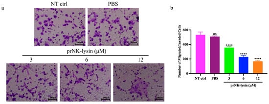 The upper chamber of the Transwell inserts was coated with a thin layer of Matrigel and incubated at 37 °C for 2 h to allow the Matrigel to solidify. A total of 200 μL of an FBS-free DMEM containing 4 × 104 cells and prNK-lysin at different concentrations was added into the upper chamber of the Matrigel-coated Transwell insert. A total of 500 µL of a DMEM containing 20% FBS was added to the lower chamber. The Transwell inserts were in the lower chamber and incubated for 24 h. The non-invaded cells were removed from the upper surface of the insert using a cotton swab. The cells that invaded through the Matrigel were fixed to the lower surface of the insert with 4% paraformaldehyde for 10 min. The cells were stained with crystal violet for 30 min, then rinsed with PBS. Counted The stained cells were counted using an inverted microscope (Olympus, Shinjuku, Tokyo, Japan).