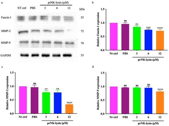 The expressions of Fascin-1, MMP-2, and MMP-3 in the Hepa1-6 cells treated with different concentrations of prNK-lysin for 24 h. (a) Images of Western blotting, (b–d) the bar statistics of expression of Fascin-1, MMP-2 and MMP-9. Fascin-1, MMP-2, and MMP-9 band intensities were quantified by Image J (v1.8.0) after GAPDH normalization. The ns means not statistically significant, ** indicates p < 0.01, *** indicates p < 0.001, and **** indicates p < 0.0001.