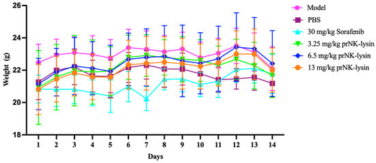 The effect of prNK-lysin on HCC growth in vivo was evaluated using the mouse liver orthotopic implantation model. As shown in Figure 11, there was no significant difference in body weight among all of the groups. The liver indices of the Sorafenib group and the 13mg/kg prNK-lysin group were significantly lower than the other groups (Figure 12). The liver tissues in HE staining showed that in the model group and the PBS group, the liver lobule structure was unclear, the hepatic cords were disorganized, the hepatic sinusoids were reduced or even disappeared, some hepatocytes were necrotic, the sizes of hepatocyte nuclei varied, and the liver cancer cells were distributed in diffuse form, most of them appearing as immature cells. In the 3.25 mg/kg prNK-lysin group, the hepatic sinusoids disappeared, and the liver cancer cells were diffusely distributed. In the 6.5 mg/kg prNK-lysin group, the hepatic sinusoids were smaller, with a clear boundary between the normal hepatocytes and the liver cancer cells. In the 13 mg/kg prNK-lysin group and the Sorafenib group, the liver lobule structure was clear, the hepatic cords were orderly arranged, the hepatic sinusoids were normal, the sizes of hepatocyte nuclei were uniform, and the distribution of the liver cancer cells was reduced (Figure 13). The results above indicated prNK-lysin inhibited the growth of Hepa1-6 cells in vivo.