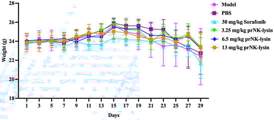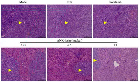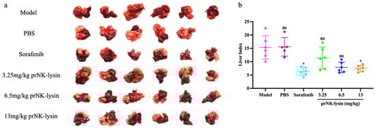 The 7-week-old male mice were anesthetized using isoflurane. The mice were placed in a supine position with the abdominal area sterilized, then a subcostal incision was made to expose the liver. The Hepa1-6 cells (5 × 105 cells/mouse) were injected into the left lobe of the liver using a fine-gauge needle. The abdominal muscle layer was closed with absorbable sutures and the skin was closed with non-absorbable sutures. The mice were closely monitored until they fully recovered from the anesthesia. Following 24 h post-surgery, the mice were randomly divided into the model group, PBS group, 30 mg/kg Sorafenib group, 3.25 mg/kg prNK-lysin group, 6.5 mg/kg prNK-lysin group, and 13 mg/kg prNK-lysin group (n = 6). The Sorafenib was dissolved in 5% DMSO and 95% PBS, and the prNK-lysin was dissolved in PBS. Except for the model group, PBS or drugs were administered into the mice of the other groups by intraperitoneal injection once a day for 14 consecutive days. The mice were monitored daily for weight loss, health, and welfare. All the mice were humanely euthanized by CO2 inhalation on the 15th day, and their livers were harvested and weighed. The liver index was calculated using the following formula: Liver Index = [Liver Weight (g)/Body Weight (g)] × 100%.