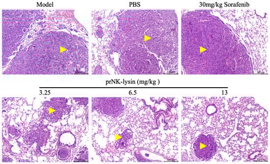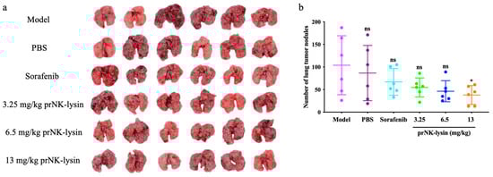 The 5-week-old male mice were anesthetized using isoflurane for cell injection. The Hepa1-6 cells (2 × 105 cells/mouse) were injected into the tail vein using a fine-gauge needle for 5 consecutive days. On the 6th day, the mice were randomly divided into the model group, PBS group, 30 mg/kg Sorafenib group, 3.25 mg/kg prNK-lysin group, 6.5 mg/kg prNK-lysin group, and 13 mg/kg prNK-lysin group (n = 6). Except for the model group, PBS or drugs were administered into the mice of the other groups by intraperitoneal injection once a day for 14 consecutive days. The mice were monitored daily for weight loss, health, and welfare. All the mice were humanely euthanized by CO2 inhalation on the 15th day, and their lungs were harvested and weighed. The number of lung tumor nodules was counted by manual counting.