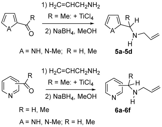 For both families of compounds, the synthesis of the N-allylamines 5a, 5b, 6a, 6c, and 6e [41,42,43,44,45] has already been reported, but not that of the C-methylated derivatives 5c, 5d, 6b, 6d, and 6f. We synthesized all of them by the addition of allylamine to the corresponding aldehyde or ketone, followed by the reduction with NaBH4 of the formed imines to the expected amines [44,46,47]. The N-allylamines were obtained in good yields (89–93%) and characterized by 1H and 13C NMR spectroscopy and a comparison of their spectra with those reported in the literature for the known compounds. For the others, infrared spectra and high-resolution mass spectra (HRMS) were added to confirm their structure (see Supplementary Materials) (Scheme 7, Table 2).