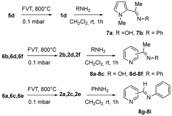 The preparation of N-H pyrrolaldimines and pyridinaldimines is therefore much more difficult than for the corresponding furan-, thiophen-, and arylaldimines [17,18,33]. We are clearly, and even more than for thiophenimines, at the limit of an approach to generating the products in the gas phase before condensation on a cold finger. Based on numerous scientific publications on the chemistry of arylaldimines, the chemistry of these pyridinaldimines is currently in progress in our laboratory as well as the search for an approach to synthesize pyrrolaldimines. It should be noted that N-H cyclopentadienimines are also still unknown to date.
