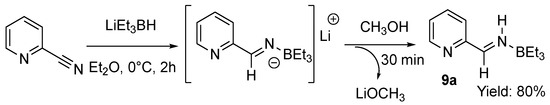 Our attempts to synthesize a complexed pyrrolimine from 2-cyanopyrrole were unsuccessful even using an excess of superhydride. However, this approach was found to be very efficient to prepare the 2-pyridinimine-triethylborane complex 9a from pyridine-2-carbonitrile (Scheme 14). This complex was obtained in 80% yield and characterized by 1H, 13C, and 11B NMR spectroscopy. Surprisingly, the same reaction with pyridine-3-carbonitrile and pyridine-4-carbonitrile gave a complex mixture of products. Unambiguously, the presence of the nitrogen atom on the pyrrole and pyridine ring considerably influences the reactivity of the corresponding nitriles with superhydride while such reactions were really easy with aryl, furan, or thiophene derivatives.