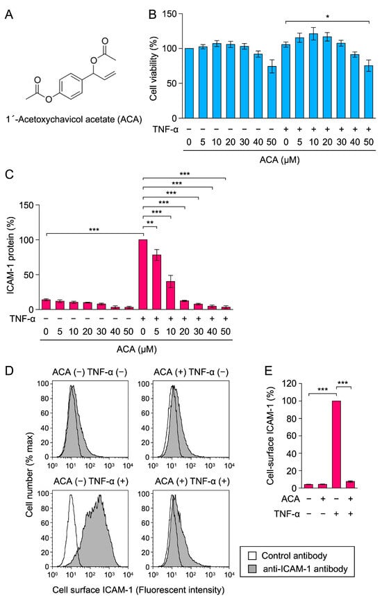 ACA inhibited TNF-α-induced ICAM-1 expression in A549 cells. (A) Structure of 1′-acetoxychavicol acetate (ACA). (B,C) A549 cells were preincubated with ACA for 1 h and then incubated with (+) or without (−) TNF-α (2.5 ng/mL) for 6 h in the presence or absence of ACA. Cell viability (%) is shown as the mean ± standard error of three independent experiments (B). Cell-ELISA was used to measure the amount of the ICAM-1 protein. ICAM-1 protein (%) is shown as the mean ± standard error of three independent experiments (C). (D,E) A549 cells were preincubated with (+) or without (−) ACA for 1 h, and were then incubated with (+) or without (−) TNF-α (2.5 ng/mL) in the presence (+) or absence (−) of ACA (30 µM). Cells were stained with a control antibody (white area) and an anti-ICAM-1 antibody (gray area) followed by a fluorescent secondary antibody, and were then analyzed by flow cytometry. Representative histograms are shown (D). Cell-surface ICAM-1 (%) is shown as the mean ± standard error of three independent experiments (E). * p < 0.05, ** p < 0.01, and *** p < 0.001.