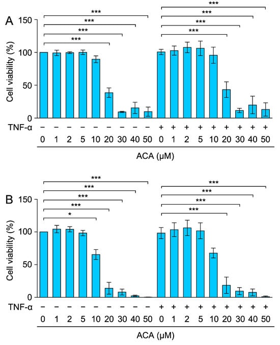 Effect of ACA on the viability of A549 cells for longer periods of time. (A,B) A549 cells were preincubated with ACA for 1 h and then incubated with (+) or without (−) TNF-α (2.5 ng/mL) for 24 h (A) and 48 h (B) in the presence or absence of ACA. Cell viability (%) is shown as the mean ± standard error of three independent experiments. * p < 0.05 and *** p < 0.001.