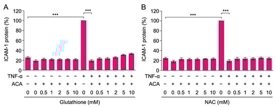 Glutathione and NAC did not reverse the inhibitory effect of ACA on TNF-α-induced ICAM-1 expression. (A,B) A549 cells were preincubated with glutathione (A) and NAC (B) for 1 h, and were then incubated with (+) or without (−) ACA (40 µM) for 1 h, followed by an incubation with (+) or without (−) TNF-α (2.5 ng/mL) for 6 h in the presence of compounds. The amount of the ICAM-1 protein was measured by cell-ELISA. ICAM-1 protein (%) is shown as the mean ± standard error of three independent experiments. *** p < 0.001.