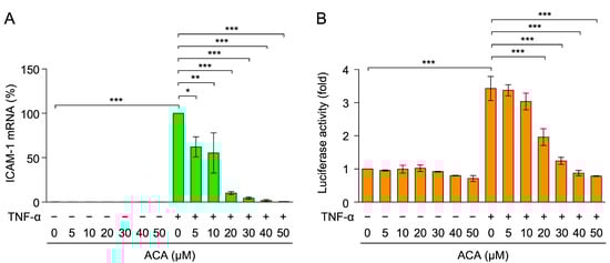 ACA inhibited TNF-α-induced ICAM-1 mRNA expression in A549 cells. (A) A549 cells were preincubated with ACA for 1 h, and were then incubated with (+) or without (−) TNF-α (2.5 ng/mL) for 2 h in the presence or absence of ACA. Real-time PCR was used to measure the amount of mRNA. ICAM-1 mRNA expression was normalized to β-actin mRNA expression. ICAM-1 mRNA (%) is shown as the mean ± standard error of four independent experiments. (B) A549 cells were transiently transfected with reporter plasmids encoding ICAM-1 promoter-driven firefly luciferase, together with a reporter plasmid encoding CMV promoter-driven Renilla luciferase for 24 h. Transfected A549 cells were preincubated with ACA for 1 h, and were then incubated with (+) or without (−) TNF-α (2.5 ng/mL) for 2.5 h in the presence or absence of ACA. Firefly luciferase activity was normalized to Renilla luciferase activity. Luciferase activity (fold) is shown as the mean ± standard error of three independent experiments. * p < 0.05, ** p < 0.01, and *** p < 0.001.