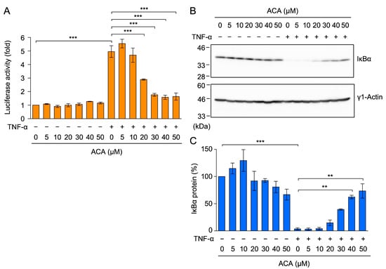 ACA inhibited the TNF-α-induced NF-κB signaling pathway in A549 cells. (A) A549 cells were transiently transfected with reporter plasmids encoding NF-κB-responsive firefly luciferase, together with a reporter plasmid encoding CMV promoter-driven Renilla luciferase for 24 h. Transfected A549 cells were preincubated with ACA for 1 h, and were then incubated with (+) or without (−) TNF-α (2.5 ng/mL) for 2.5 h in the presence or absence of ACA. Firefly luciferase activity was normalized to Renilla luciferase activity. Luciferase activity (fold) is shown as the mean ± standard error of three independent experiments. (B,C) A549 cells were preincubated with ACA for 1 h, and were then incubated with (+) or without (−) TNF-α (2.5 ng/mL) for 15 min in the presence or absence of ACA. Western blotting was performed to analyze cell lysates. Representative blots of IκBα and γ1-actin expression are shown (B). The amount of the γ1-actin protein was used to normalize the amount of the IκBα protein. IκBα protein (%) is shown as the mean ± standard error of three independent experiments (C). ** p < 0.01 and *** p < 0.001. Original blots are shown in Figures S1–S4.