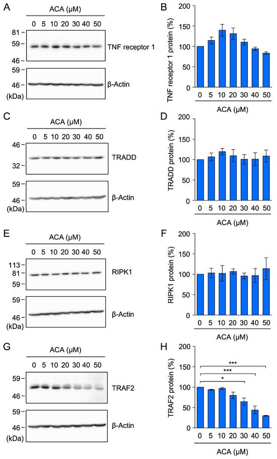 In response to a TNF-α stimulation, TNF receptor 1 has been shown to form a membrane-bound complex to trigger the NF-κB signaling pathway by recruiting TRADD, RIPK1, and TRAF2 [,,]. To investigate the effects of ACA on the expression of components of the TNF receptor 1 complex, A549 cells were incubated with ACA for 1 h, cytoplasmic fractions were prepared as cell lysates using 1% Triton X-100, and these lysates were analyzed by Western blotting. ACA at concentrations up to 50 µM did not markedly affect TRADD or RIPK1 protein expression (Figure 6C–F). In contrast, ACA at 30–50 µM reduced TRAF2 protein expression (Figure 6G,H). These results showed that among the components of the TNF receptor 1 complex, ACA selectively reduced TRAF2 protein expression.
