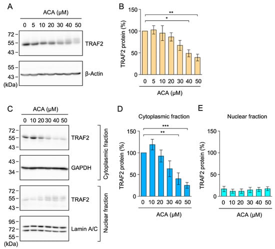 To further confirm the effects of ACA on TRAF2 protein expression, A549 cells were incubated with ACA for 1 h, and whole-cell lysates were prepared using 1% SDS lysis buffer. In whole-cell lysates, ACA reduced TRAF2 protein expression in a dose-dependent manner (Figure 7A,B). To clarify whether ACA promoted the translocation of the TRAF2 protein from cytoplasmic fractions to nuclear fractions, we lysed A549 cells using 1% Triton X-100 lysis buffer and separated them into cytoplasmic fractions and nuclear fractions containing nuclei and insoluble materials. A treatment with ACA for 1 h did not significantly affect the amount of the TRAF2 protein in nuclear fractions, while it decreased that in cytoplasmic fractions (Figure 7C–E). Therefore, these results showed that ACA promoted the downregulation of TRAF2 protein expression in whole-cell lysates.