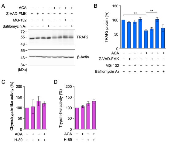 ACA promoted the proteasomal degradation of TRAF2 in A549 cells. (A,B) A549 cells were preincubated with (+) or without (−) Z-VAD-FMK, MG-132, and bafilomycin A1 for 1 h, and were then incubated with (+) or without (−) ACA for 1 h (40 µM) in the presence of Z-VAD-FMK (20 µM), MG-132 (20 µM), and bafilomycin A1 (100 nM). Western blotting was used to analyze whole-cell lysates. Representative blots for the expression of TRAF2 and β-actin are shown (A). The amount of the β-actin protein was used to normalize the amount of the TRAF2 protein. TRAF2 protein (%) is shown as the mean ± standard error of three independent experiments (B). ** p < 0.01. Original blots are shown in Figures S33–S36. (C,D) A549 cells were preincubated with (+) or without (−) H-89 (10 µM) for 1 h, and were then incubated with (+) or without (−) ACA (50 µM) for 1 h at the indicated concentrations. Chymotrypsin-like activity (%) (C) and trypsin-like activity (%) (D) are shown as the mean ± standard error of three independent experiments. No significant differences were observed in Figure 8C,D.