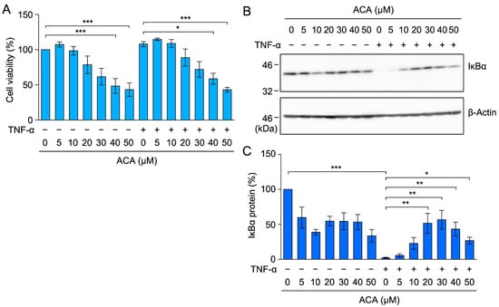 ACA inhibited TNF-α-induced IκBα degradation in HT-1080 cells. (A) HT-1080 cells were preincubated with ACA for 1 h, and were then incubated with (+) or without (−) TNF-α (2.5 ng/mL) for 2 h in the presence (+) or absence (−) of ACA. Cell viability (%) is shown as the mean ± standard error of three independent experiments. (B,C) HT-1080 cells were preincubated with ACA for 1 h, and were then incubated with (+) or without (−) TNF-α (2.5 ng/mL) for 15 min in the presence (+) or absence (−) of ACA. Western blotting was performed to analyze whole-cell lysates. Representative blots for the expression of IκBα and β-actin are shown (B). The amount of the IκBα protein was normalized to the amount of the β-actin protein. IκBα protein (%) is shown as the mean ± standard error of three independent experiments (C). * p < 0.05, ** p < 0.01, and *** p < 0.001. Original blots are shown in Figures S37–S40.