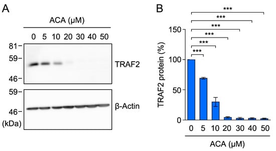 ACA downregulated the expression of TRAF2 in HT-1080 cells. (A,B) HT-1080 cells were incubated with ACA for 1 h. Western blotting was performed to analyze cell lysates. Representative blots for the expression of TRAF2 and β-actin are shown (A). The amount of the β-actin protein was used to normalize the amount of the TRAF2 protein. TRAF2 protein (%) is shown as the mean ± standard error of three independent experiments (B). *** p < 0.001. Original blots are shown in Figures S41–S44.