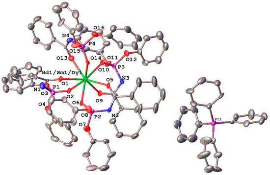 The molecular structures of one of the [Nd/Sm/Dy(L)4]− anions (left) and PPh4+ cations (right) for PPh4[LnL4] (Ln = Nd, Sm, Dy). The hydrogen atoms are omitted for clarity. C atoms are coloured in grey, O atoms—in red, N atoms in blue, P atoms in violet and Ln—in green.